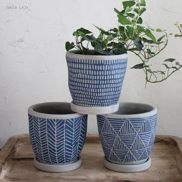 カジュアルヴィンテージなテイストにも合わせやすい、デザイン性の高いポット。少しいびつな形と、手彫りで彫ったような柄の上に、更にペイントを施した、手のこんだ作り。穴ありで皿が付いているので、室内のインテリアにもマッチ。サボテンや多肉も似合います。