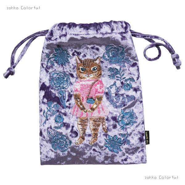 なめらかなベロア生地に、ナタリー・レテさんの愛らしい動物たちが刺繍で描かれた巾着です。