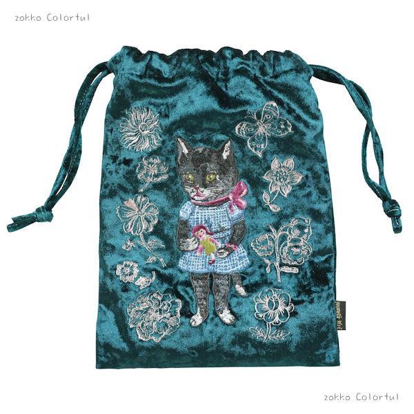 なめらかなベロア生地に、ナタリー・レテさんの愛らしい動物たちが刺繍で描かれた巾着です。