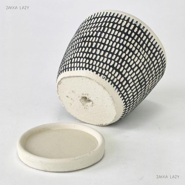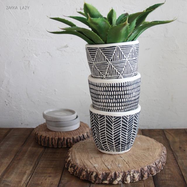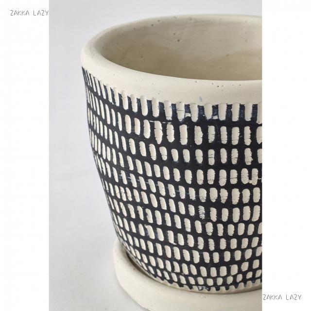 カジュアルヴィンテージなテイストにも合わせやすい、デザイン性の高いポット。少しいびつな形と、手彫りで彫ったような柄の上に、更にペイントを施した、手のこんだ作り。穴ありで皿が付いているので、室内のインテリアにもマッチ。サボテンや多肉も似合います。