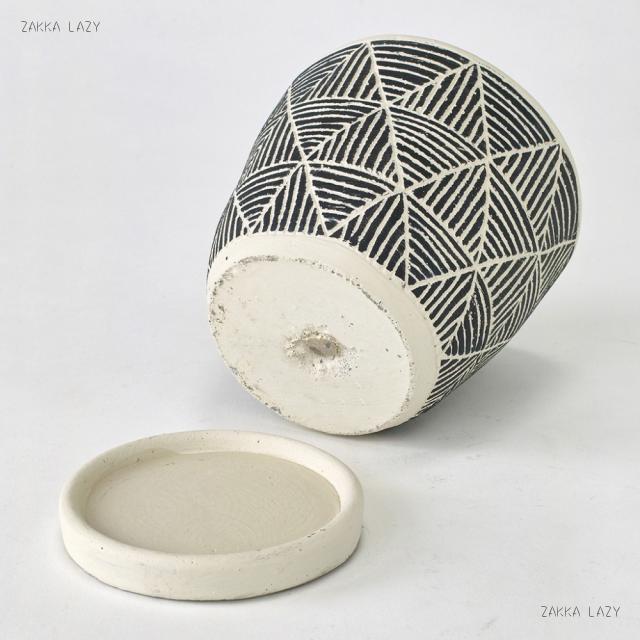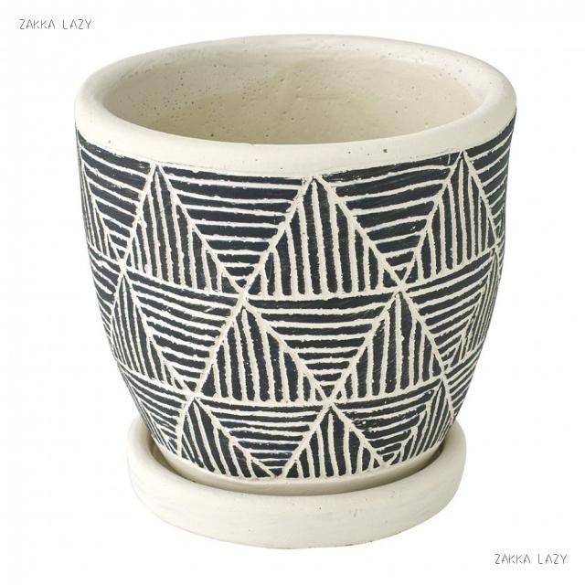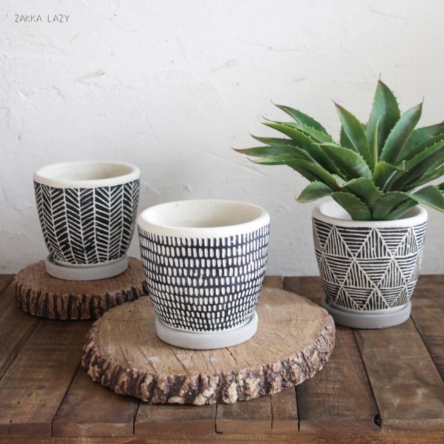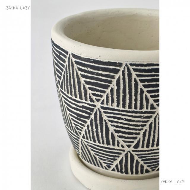 カジュアルヴィンテージなテイストにも合わせやすい、デザイン性の高いポット。少しいびつな形と、手彫りで彫ったような柄の上に、更にペイントを施した、手のこんだ作り。穴ありで皿が付いているので、室内のインテリアにもマッチ。サボテンや多肉も似合います。
